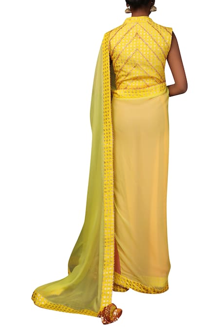 Yellow Chiffon Plunging V-shaped Neckline Saree With Printed Blouse