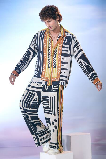 Black and white full sleeves shirt featuring an abstract maze print with contrasting orange-yellow striped detailing. Paired with matching printed pants for a coordinated look.