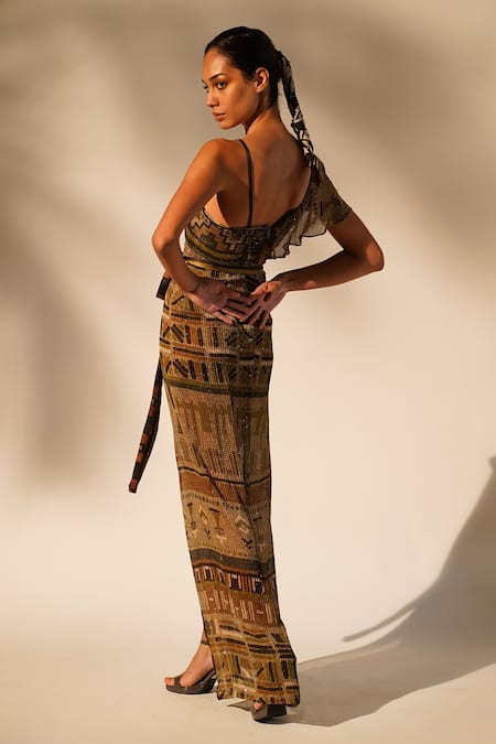 Green asymmetric sleeve gown featuring an all-over aztec print with sequin embellishments