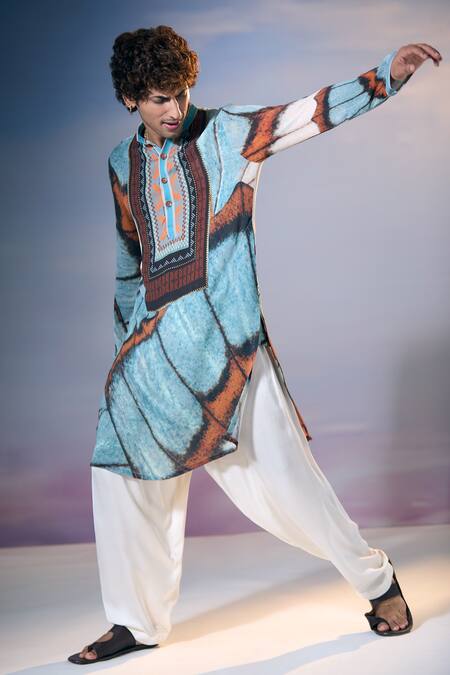 Powder blue kurta featuring full sleeves and butterfly wings print. Paired with an off-white salwar and attached lining.