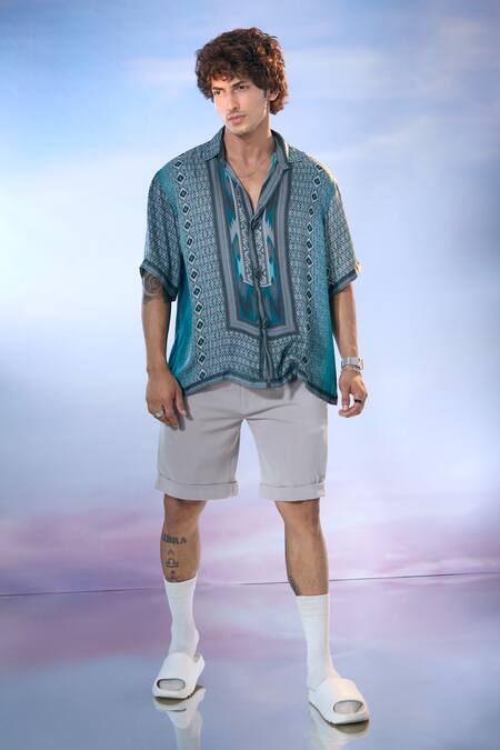 Turquoise blue half sleeves shirt featuring an all-over Diamond Dream print and geometric symmetry print near the placket. Paired with luxe suiting beige shorts for a relaxed look.