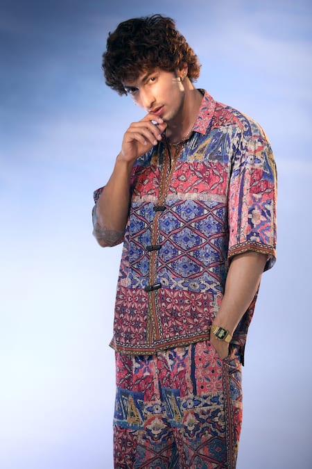 Multi color shirt featuring half sleeves and collar neck with an all-over Fleur carpet print. Paired with matching printed pant for a cohesive look.
