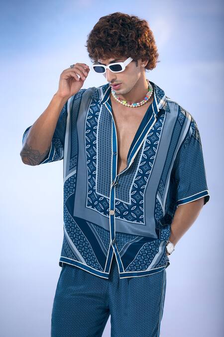 Blue shirt featuring a geometric bloom print with half sleeves and a collar neck. Paired with matching printed pants for a cohesive look.
