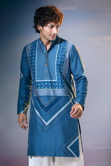 Blue kurta featuring full sleeves and a mandarin collar with a geometric gul bloom print. Paired with a satin salwar and attached lining.