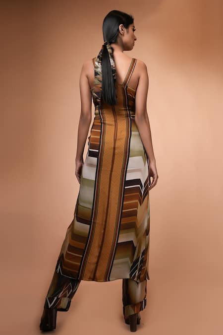 Sundown coffee asymmetric sleeveless tunic with geometric pattern, side buckle detail & belted straps.
