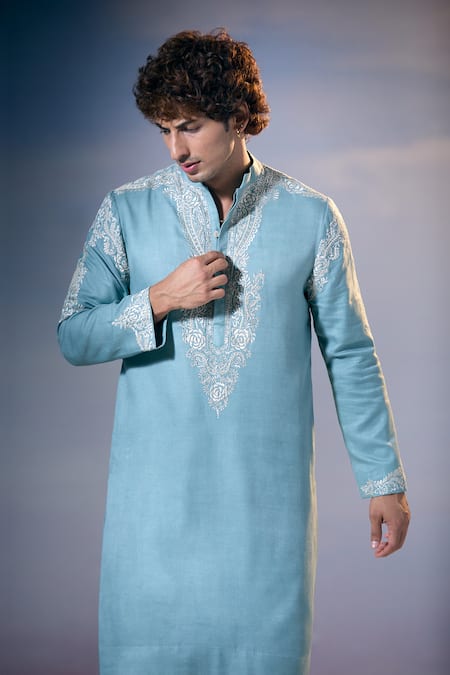 Powder blue kurta featuring full sleeves and kamdani tikki bloom embroidery. Paired with an off-white salwar and attached lining.