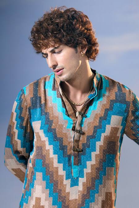 Blue and multi color kurta featuring a mosaic graphic print with sequin highlights. Paired with an off white salwar and attached lining.