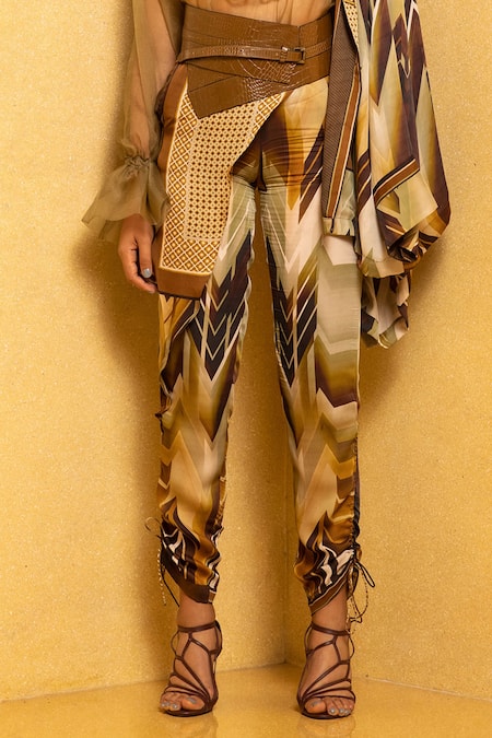 Coffee shaded, sundown printed draped pant in satin base fabric with bottom tie up details.