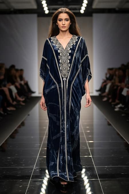 A deep blue velvet kaftan featuring a swirl print and baroque embroidery.