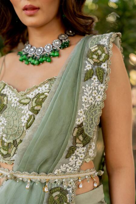 Green skirt saree featuring a detachable drape with thread, beads, nakshi & tassels embroidered borders. Paired with a padded blouse and a belt.
