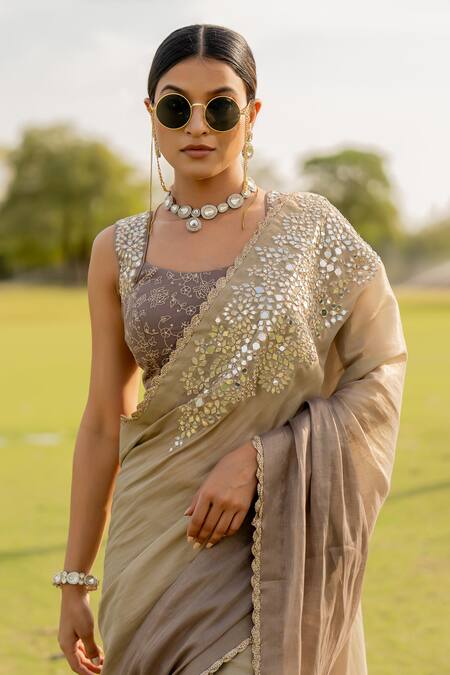 Platinum double hued saree featuring mesh lace, mirror tassels and an embroidered palu. Paired with an embroidered shoulder jaal organza padded blouse.