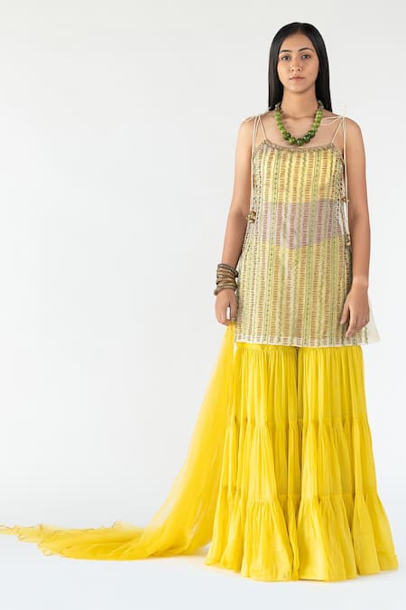 Yellow Organza, Gazi Silk Beads Scoop Neck Embroidered Kurta Sharara Set