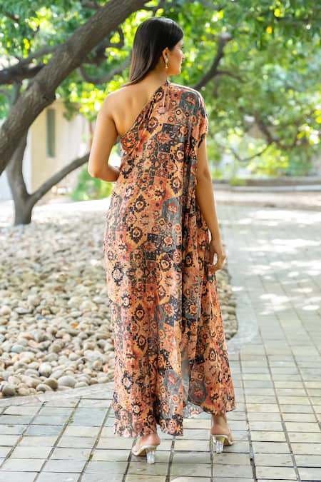 Orange Organza One Shoulder Floral Mosaic Pattern Dress