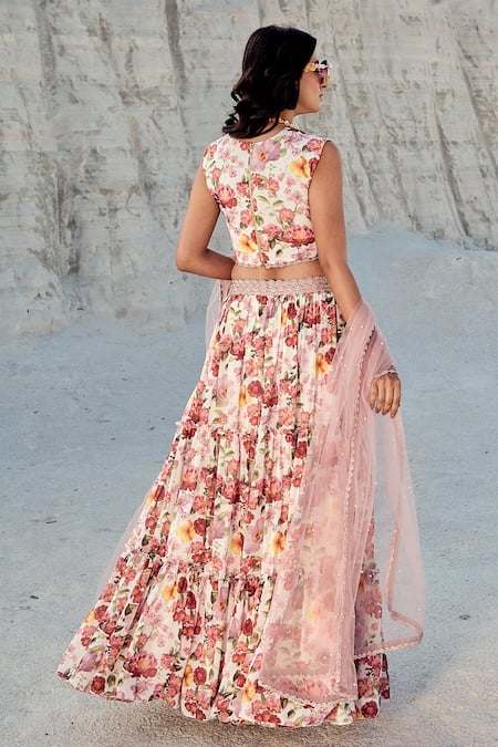 Purple floral printed lehenga featuring tiered detailing and a hand knotted mesh waistband. Paired with a sleeveless padded blouse and a dupatta.