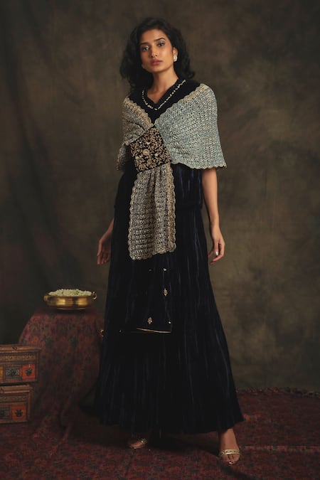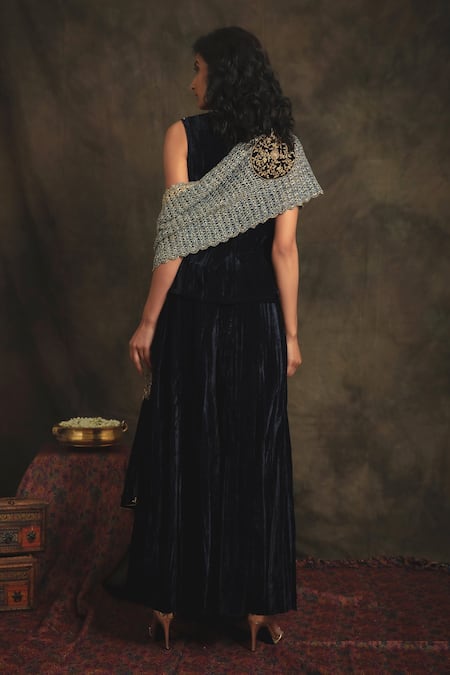 Buy_Nikita Vishakha_Blue Top And Palazzo Velvet Stole Mesh Zardozi V Neck Gazal Set With_at_Aza_Fashions