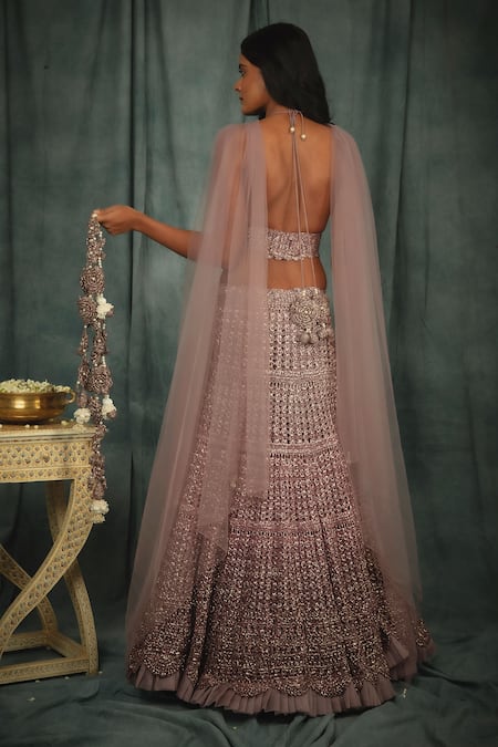 Purple hand crochet plunge neck scallop blouse. Paired with crochet lehenga with ruffle hem and sheer cape style dupatta with pearl work detail.