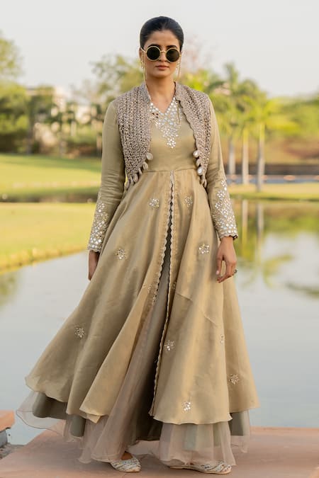 Beige flared kurta featuring mirror work on the neckline and sleeve cuffs. Paired with a lehenga and a mesh jacket with mirror tassel details.