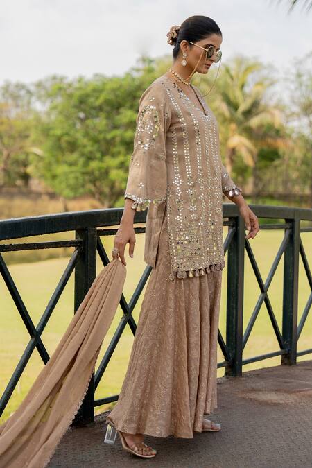 Rose gold kurta featuring mirror embroidery all over. Paired with a jaal sharara and a chinnon butti, mirror hanging detailed dupatta.