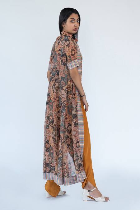 Brown Crepe, Georgette Floral Jacket Front Open, Printed Cape And Dhoti Pant Set