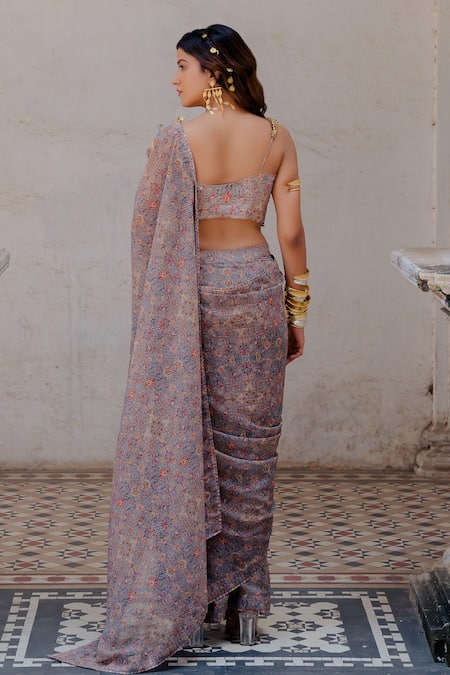 Grey Bralette Silk, Saree Georgette Persian Pattern, Zari Printed With Blouse