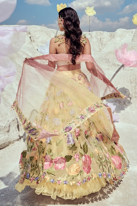 White and yellow lehenga featuring resham embroidery with mirrors and mesh flower embellishments. Paired with a padded bralette and an ombre dyed net dupatta.