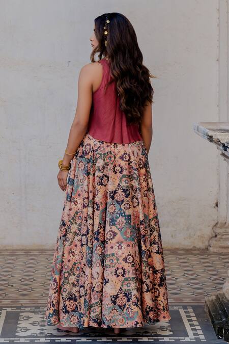 Rust silk pleated lehenga with all over Persian carpet pattern print. Paired with raw silk high neck crop top with zari dori embroidery.