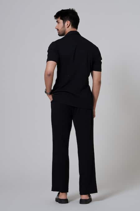 Black shirt featuring multiple pockets and a relaxed fit. Paired with matching black pants for a coordinated look.