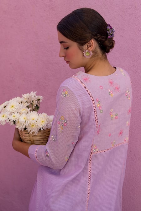 Purple short kurta featuring a notched round neck, three fourth sleeves, and bloom embroidery on the yoke. Paired with a floral hem embroidered salwar, crafted in cotton kota with attached lining.