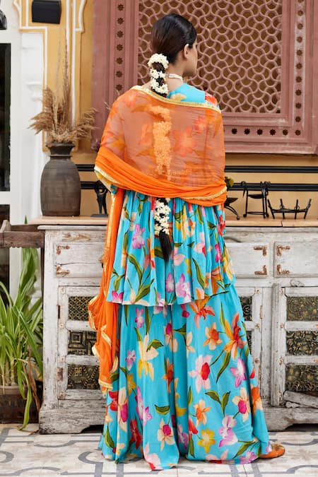 Sky blue floral print V neck embellished peplum kurta. Paired with a matching sharara and coordinating dupatta.