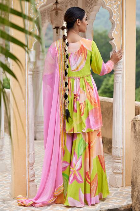 Green embellished peplum kurta featuring a V neckline and long sleeves. Paired with a sharara and a pink dupatta.