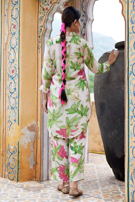 Off White Crepe Collared Floral Print Apple Cut Kurta And Pant Set