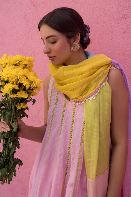 Multi-color dupatta with shell button lace embellishments, Lace embroidery on kurta, Attached lining for comfort
