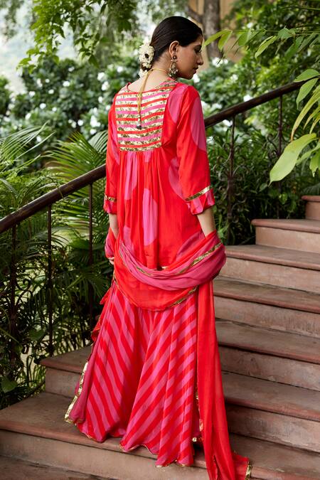 Red kurta featuring notched neckline with lace details and three-quarter sleeves. Paired with a striped sharara and a dupatta.