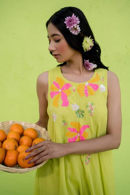 Green Cotton, Kota Doria Embroidery, Sequins Round Neck Flora Patch Midi Dress