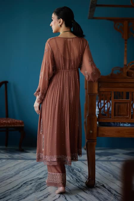 Buy_Label Nimbus_Brown Georgette Hand Embroidered Salli V Neck Kurta Pant Set_at_Aza_Fashions
