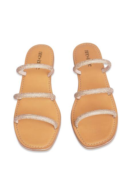 Rose gold flats featuring faux diamond embellished straps and an open toe design