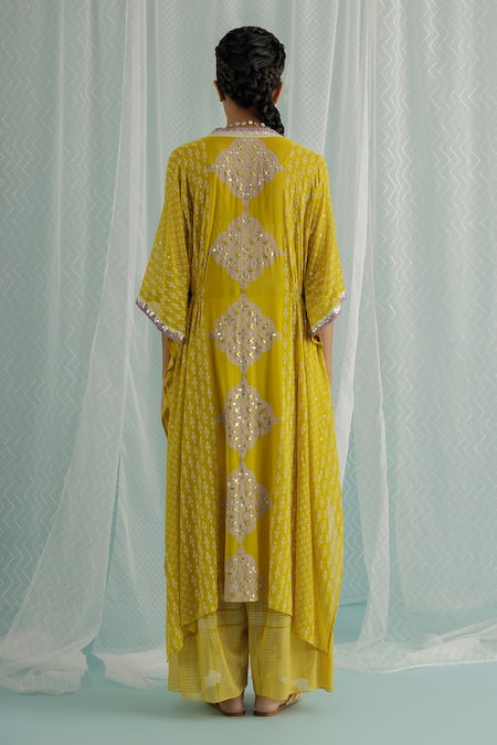 Yellow cape featuring geometric hand block print with gota, sequin, and bead embroidery. Paired with a matching blouse and low crotch trouser, both in georgette fabric.