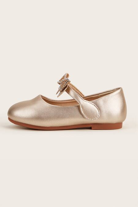 Gold bellies featuring bow stud embellishment on strap and round toe detailing