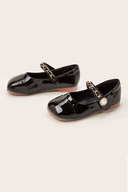 Black bellies featuring a square toe design with a metallic chain and bead embellishment on the strap