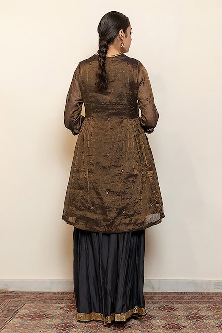 Black chanderi tissue kurta featuring embroidered floral and half moon motifs with side gathers. Paired with an inner and matching gharara in cotton silk.