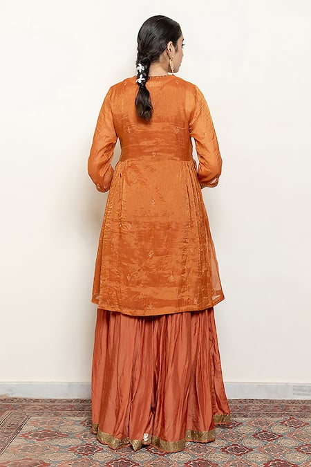 Orange kurta featuring floral and half moon motifs with side gathers. Paired with a matching gharara and inner lining.