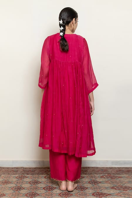 Buy_Nirjara_Pink Cotton, Chanderi Embroidery Boat Neck Farah Yoke Kurta And Pant Set _Online_at_Aza_Fashions
