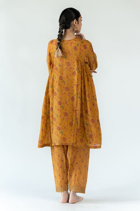 Yellow kurta featuring a floral pattern with gather detailing at the side. Paired with matching pants that have an embroidered aari tikki border at the hem.