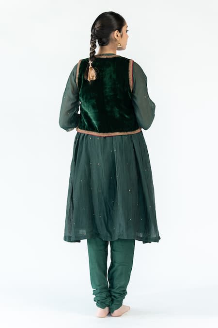 Emerald green sadri in velvet featuring marodi kangri embroidery and quilted lining