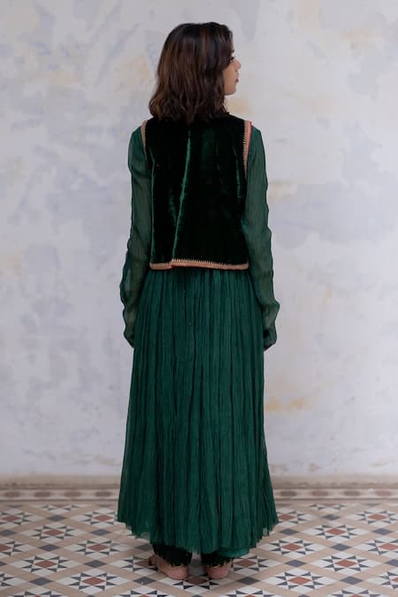 Emerald velvet sadri style jacket with traditional embroidered crescent pockets and borders in marodi embroidery.