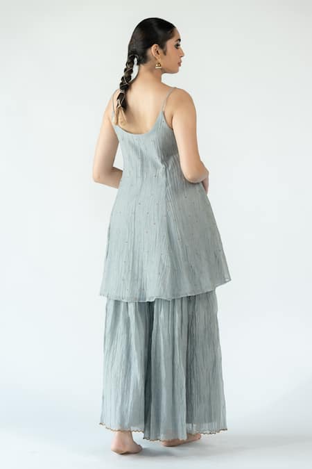 Grey kurta featuring sitara embroidery with a relaxed fit. Paired with a matching gharara that has embroidered panels and scalloped edges.