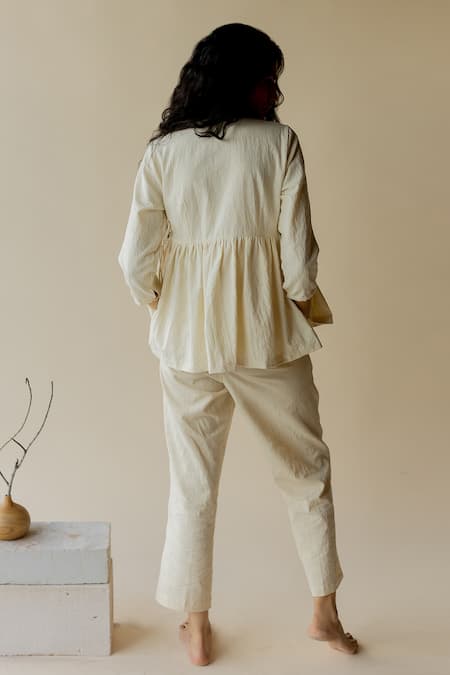 Off White Handloom Cotton Beads V-neck Ren Kediyu Neckline Embellished Top