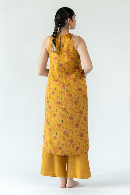 Mustard kurta featuring a floral print with afghani hand applique gaji yoke and embroidered floral jaal. Paired with matching cotton satin pants.