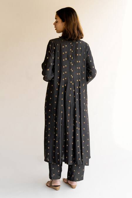 Black hand woven banarasi silk anarkali. Paired with woven pant.