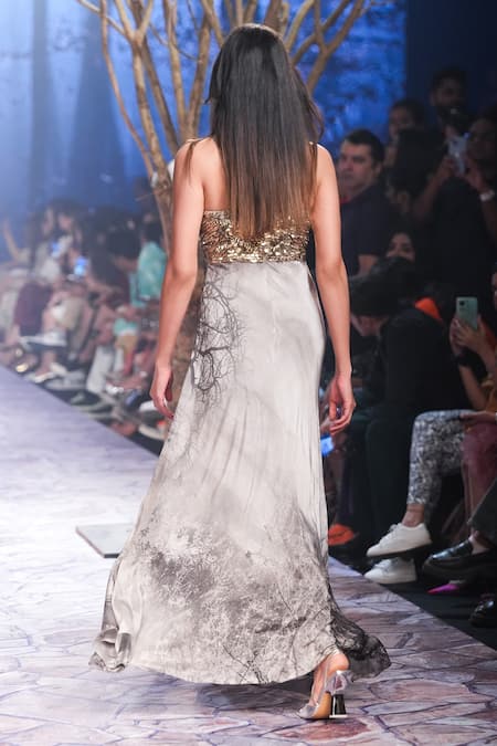 Sequin embroidered bodice, Plunge V neckline detail, Abstract print design